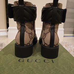Step out in style with these Gucci women's boots. Featuring a chic black and brown design, these boots are perfect for any occasion. The iconic Gucci branding adds a touch of luxury to your wardrobe.