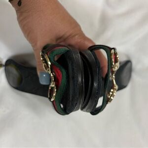 Elegant Gucci mules with a striking black and green design. Gold accents enhance the luxurious look. Perfect for any stylish occasion. make sure to open the photos