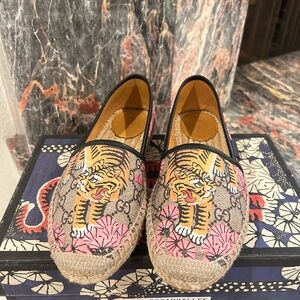 Elegant Gucci espadrilles with a bold black and pink pattern. Perfect for a chic, stylish look.