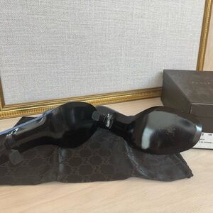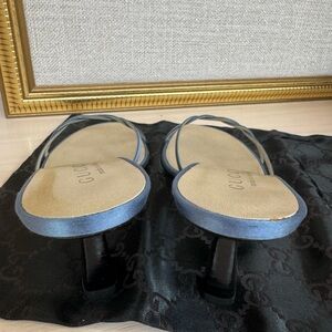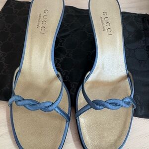 Chic Gucci sandals with a braided blue strap. Elegant tan footbed for versatile style.
