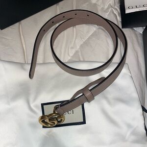 Chic Gucci leather belt in brown. Features iconic gold GG buckle. Perfect for adding luxury to any outfit.