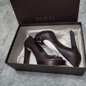 Brand new, never worn. Crafted from Guccissima leather in a brown hue and featuring Horsebit details on the uppers. These pumps are set on 11.5 cm heels supported by platforms and finished off with peep-toes.