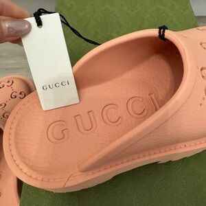 Elevate your look with Gucci platform mules. Stylish coral hue. Perfect for casual elegance.