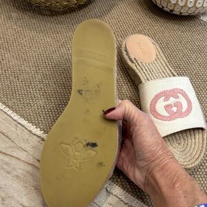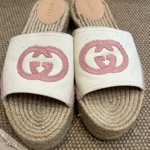 Elegant Gucci espadrille sandals with a cream and pink design. Perfect blend of style and comfort.