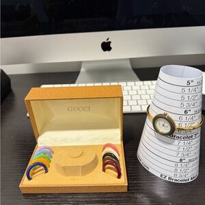 Chic Gucci watch in gold. Comes with vibrant interchangeable bezels. Perfect for versatile styling.