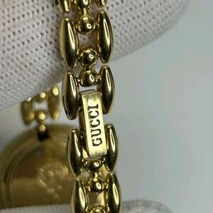 Elegant Gucci watch with a gold bracelet. Comes with interchangeable bezels in black, red, green, silver, and blue. Perfect for versatile styling.