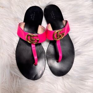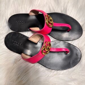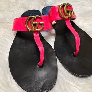 Chic hot pink sandals by Gucci. Features striking gold logo detail. Ideal for a bold fashion statement. All of the “effects” are shown in the pictures. Sandals are not ripped or in bad condition. Fairly used and in great condition! Open to offers