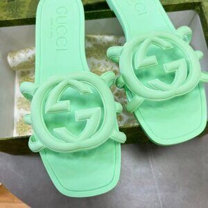 Gucci women's light blue slides with signature interlocking logo. Size 9, lightweight rubber material, flat heel, comfortable to wear. Perfect for travel, parties or casual wear in summer, fall or spring. This slip-on sandal is standard width. Made in Italy, part of the Gucci Marmont collection
