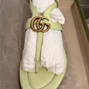 Elegant Gucci sandals in light green. Features iconic gold logo detail. Perfect for stylish outings.