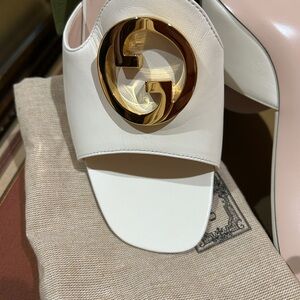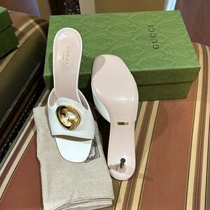 Elegant Gucci Blondie GG Open Toe Heeled Mules in Mystic White with iconic gold logo. Perfect for a stylish look. Size 39.5 (9 1/2) NWT, shoe bag and box
