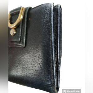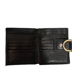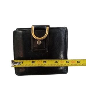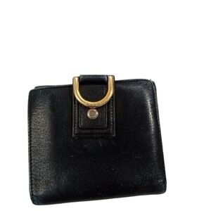 Classic and compact, this Gucci black leather fold-over wallet features smooth leather construction with a gold-tone D-ring accent. Timeless and functional with interior slots for cards and bills—perfect for everyday luxury in a sleek silhouette.
