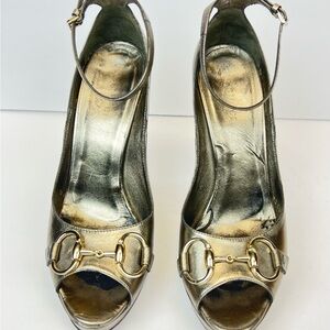 Gucci Women’s Pewter Metallic Ankle Strap Wedge Heels Size 7B Vintage