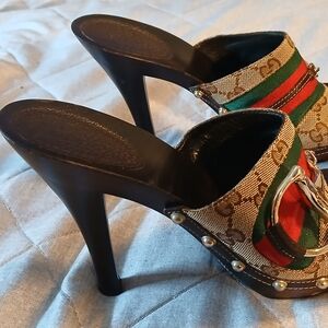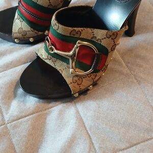 Chic Gucci sandals with gold hardware. Features iconic red and green stripes. Ideal for fashionable events.