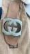 Chic Gucci sandals in light blue. Features bold logo design with black accents. Ideal for fashionable wear.
