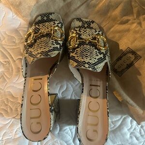 Chic Gucci mules with snake print. Gold chain detail adds elegance. Perfect for stylish outings.