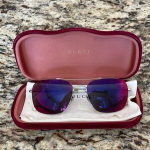 Chic Gucci sunglasses with a bold red and purple gradient. Add luxury to your look.
