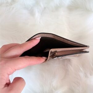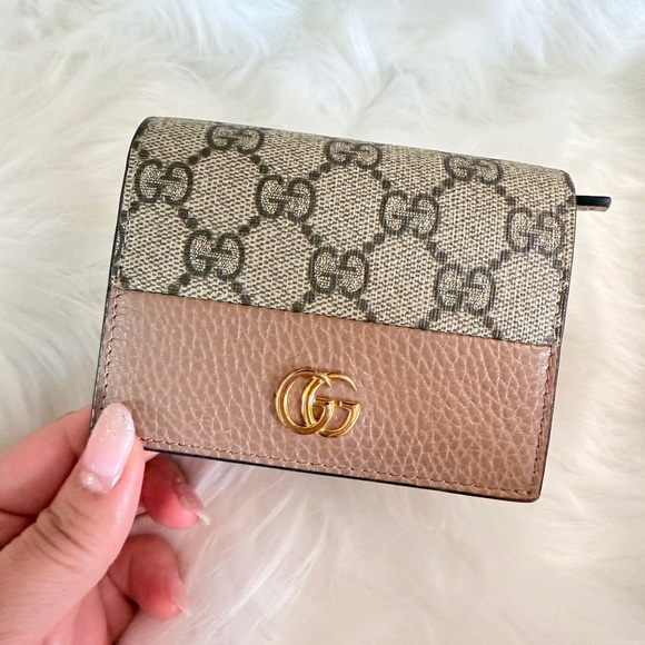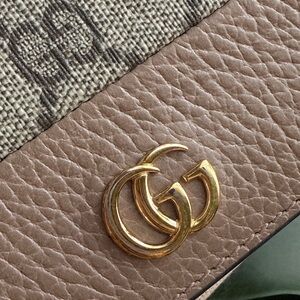Chic Gucci wallet with iconic pattern. Features beige and tan tones. Stylish gold logo accent.