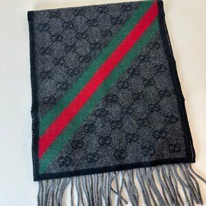 This is an authentic GUCCI Wool Angora Monogram Web New Nikky Scarf Lead in Dark Green. This scarf is finely crafted of 100% wool with a light grey Gucci monogram with reverse coloring on the opposite side, and fringes at either end.