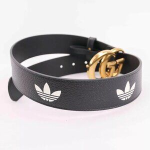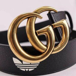 This is a new Gucci X Adidas Double Interlocking G Belt. It features an iconic double 'G' gold-tone buckle and a black leather strap with the Adidas trefoil logo.