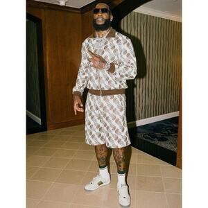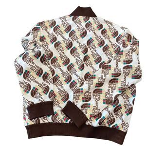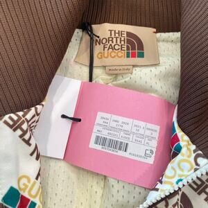 **Features a white polyester knit; brown ribbed stand collar, cuffs, and hem; white zip front; long sleeves; & allover gold/web Gucci, and brown The North Face Gucci x The North Face logo print