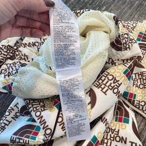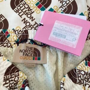feature a white polyester knit; ivory drawstring elastic waist; above-the-knee length; brown piping down the sides; upper-side slit pockets; & allover gold-tone/web Gucci, and brown The North Face Gucci x The North Face logo print.