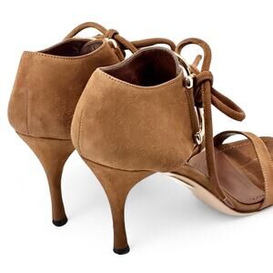 These elevated Y2K-era sandals in rich cognac suede features a sleek stiletto heel and ankle tie straps for a statement, designer look, a Tom Ford vision.