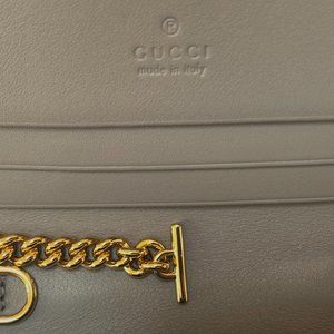 This compact card case features a two-tone GG horse-bit logo on the front and a removable chain strap, and opens to 4 card slots, 2 slip pockets, 1 bill slot, and a zipped coin pouch.