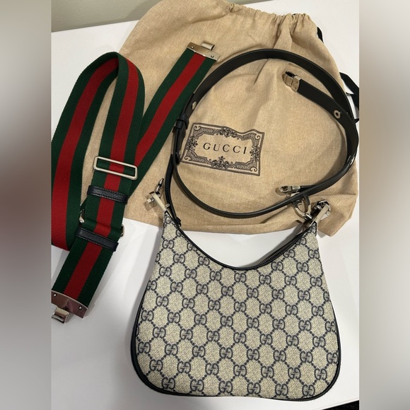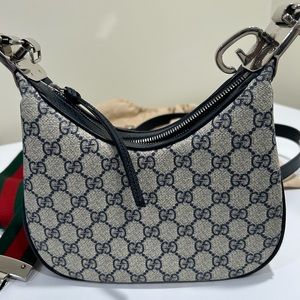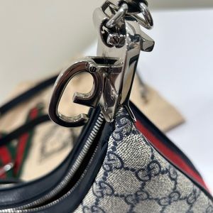 An ode to the timeless Hollywood glamour that shaped Gucci Love Parade, classic elements from the House's archives are reintroduced. Distinguished by its crescent moon shape, this small shoulder bag further defined by a G shaped hook closure. Paired with soft materials, the heritage hardware creates a refined design with vintage appeal. GG Supreme canvas in beige and blue accentuate the logo feel.