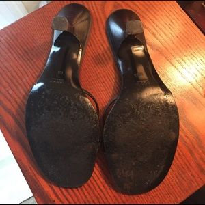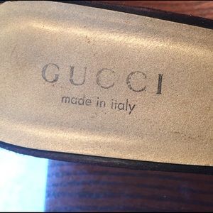 Authentic Gucci sandals. Black with wrapped twist design, it is a canvas with a sheen finish. Simple kitten heel at just about 2 inches beautiful simple elegant design. Once you have the shoes on you cannot see the soul so any of the light discoloration and you can see in the photos you don't notice because the shoes on. Nice low heel so they are easy to walk in. Great spring and summer shoe. Well loved with lots of where left. Please ask questions if you have any and open to reasonable offers