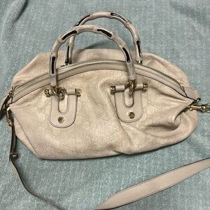 Gucci bag. Absolutely genuine. A bamboo handle. The bag is a little dirty. The bottom corners of the bag are slightly frayed. All the disadvantages can be seen in the picture. Equipped with dustbag.