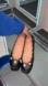 Black leather, scalloped edge, pearl accents, gold-tone hardware, round toe