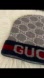 Pre-owned try it on but never actually used it..Gucci grey and baby striped beanie hat. Super cute..unisex one size