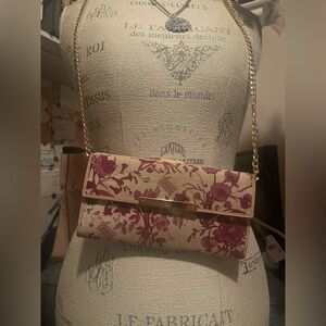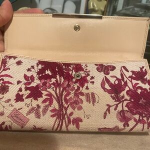 Elegant Gucci wallet with floral design. Features pink floral patterns on cream canvas. Gold-tone hardware accent.