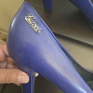 Gucci blue leather pumps 38.5, US 8.5 according to their size chart. Serial number 247525. Made in Italy matte leather pumps with gold metal Gucci logo on the side. Heel measures approximately 3.5".