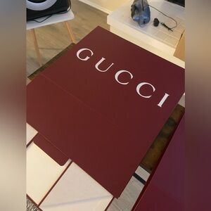 Two medium and one small Gucci boxes. I didn’t use them but the sales associates sent them home with me. They are from the flagship store in Paris. Magnetic closure. Great for the holidays.