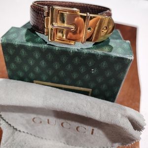 Leather brown and gold Gucci bracelet. used and fair condition check pictures for some discoloration on the hardware and other details
