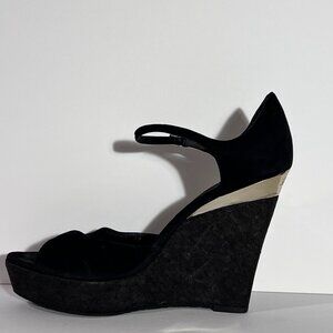 Gucci by Tom Ford Cork Wedge Black Suede Silver Logo Heels Sz 8