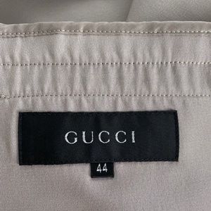 Gorgeous silk blazer by Gucci. It's been unworn in my closet for years. "Zamasport for Gucci" is from the Tom Ford era. I'd describe the color as Taupe, but it can look different in different lighting as show as it has a sheen to it. It's a GREAT neutral. The front buttons are Iridescent with "Gucci" on them. 2 front pockets with flaps--have not been cut open yet. Slant chest pocket is open. Silk/Nylon blend. Unlined. Size 44/US 8.