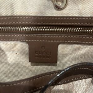 Gucci tote bag. It features the classic GG monogram pattern in a beige & light tan color, with brown leather trim and handles. The straps are attached with gold-toned hardware, and the overall design is structured yet roomy, ideal for everyday use. The neutral tones and iconic branding make it a versatile accessory. Slight wear visible. Makeup stains inside of bag.