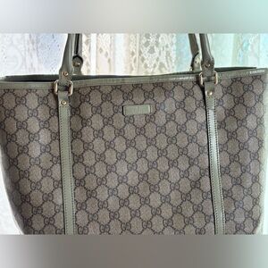 This Gucci tote bag showcases the iconic GG monogram pattern in a sophisticated tan color. Crafted with a spacious design, Ideal for those who appreciate both style and practicality, this tote is a timeless addition to any collection.