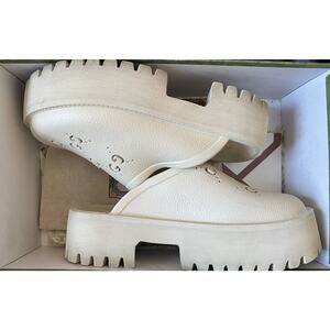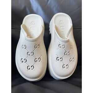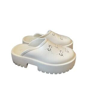 The product is a pair of Gucci clogs in white, designed for women. They have a UK shoe size of 6, US shoe size of 7, and EU shoe size of 37. The clogs are casual in style, made of rubber material, and feature a comfortable design suitable for everyday wear.