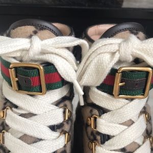 GUCCI combat womens 36/6 Monogram GG ankle Lace Up, Wool covered in Beige, Chocolate brown with ankle strap. Authentic Gucci in great to excellent pre loved condition.