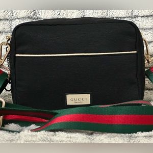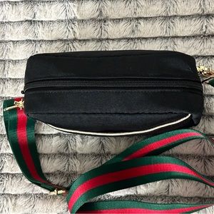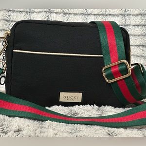 Gucci cosmetic bag converted into crossbody bag by adding unbranded strap and rivets
