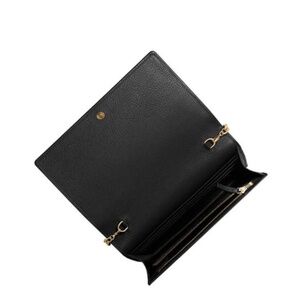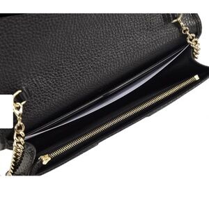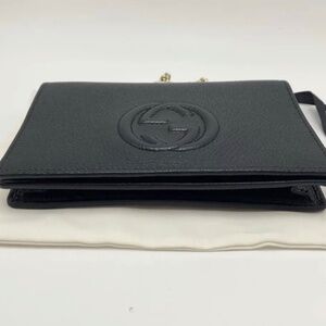 Used a handful of times. Love this piece. Very practical. Made in Italy Soho Leather Crossbody wallet on a chain, black leather and light fine gold/silver hardware with embossed interlocking G logo Interior. Canvas and leather lining, zippered pocket, 6 card slots Removable shoulder strap drops 25in Fold-over flap with snap closure Dark baby blue almost black | clutch | wallet | Gucci | handbag