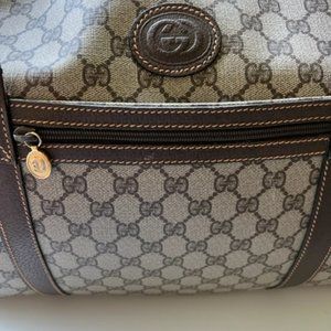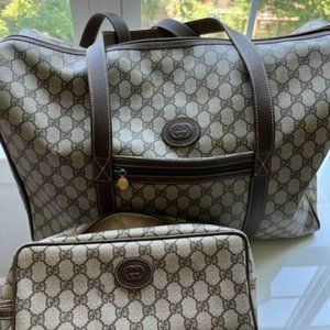 Authentic Gucci duffle and matching shaving kit. Great weekend bag! Measures approximately 20''x12''. Structurally in very good condition. *There is a water stain. See picture. Priced with the stain in mind. Signature Gucci logo in tan and brown. Overall, excellent canvas duffle bag.