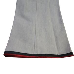 Mid-rise. Slant pockets in front. Zipper, hook & eye closure. Red and green signature embroidery at hem