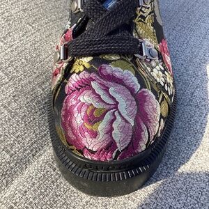Gently worn ( couple times ) these Gucci boots are in excellent condition. From 2018 ( I’m original owner) multicolored jacquard floral pattern embroidered into black . 2 1/2” chunky heel , rugged lug sole with snake , logo tab at tongue, antiqued silver eyelets and soft leather lining. These boots can be worn with jeans or dresses . Comes with original box , two dust bags and extra set of red laces. Please look at all pics.