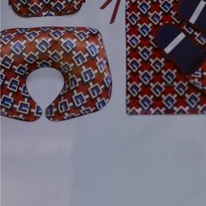 Comes with slippers, mask, and neck, pillow, and carrying case and original box and all tags. Great gift idea.