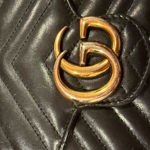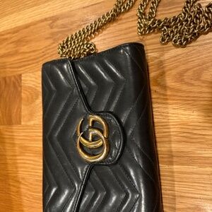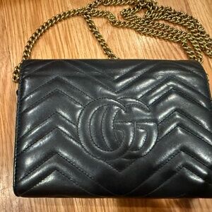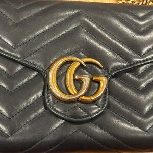 Navy blue, gold hardware, comes with box (ripe in corner of box). Some discoloration on the gold hardware. Beautiful bag for night out. Perfect size chain, not too long. The inside of the purse is cholth and the structure is a little lose. Still a great luxury crossbody bag.