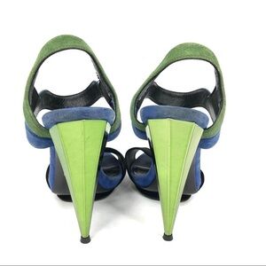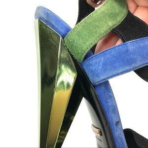 Authentic Gucci blue green suede leather open-toe heels. Octagonal/prism-shaped mirror/reflective heels. Elastic gussets at ankle. Leather upper, lining, and sole. Five-inch heel, with .5” platform. Size 36.5. Excellent used condition. One small mark and one ding in heel (both shown up-close in photos).